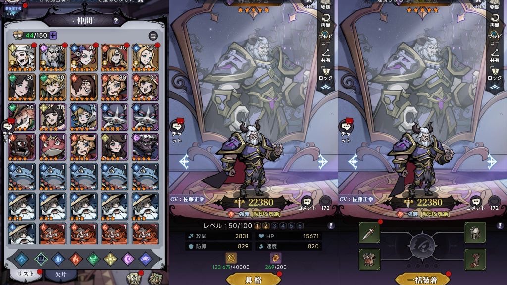 キャラの育成や進化、4箇所ある装備をつけたりしてキャラを強くしていきましょう!レベルアップに必要な素材は放置でたまるシステムも搭載されていますので時間が無い方でもスキマ時間にキャラを強くできます!ガチャで得たキャラを強化素材にもできるので最初からたっぷりゲットできますね!